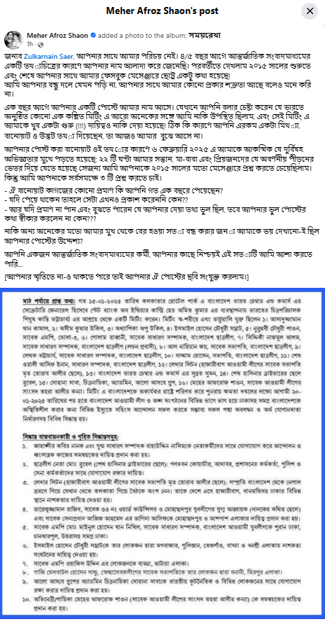 জুলকারনাইন সায়েরের পেশাদারিত্ব নিয়ে প্রশ্ন তুলে শাওন তিনটি সুনির্দিষ্ট প্রশ্ন করেন:
