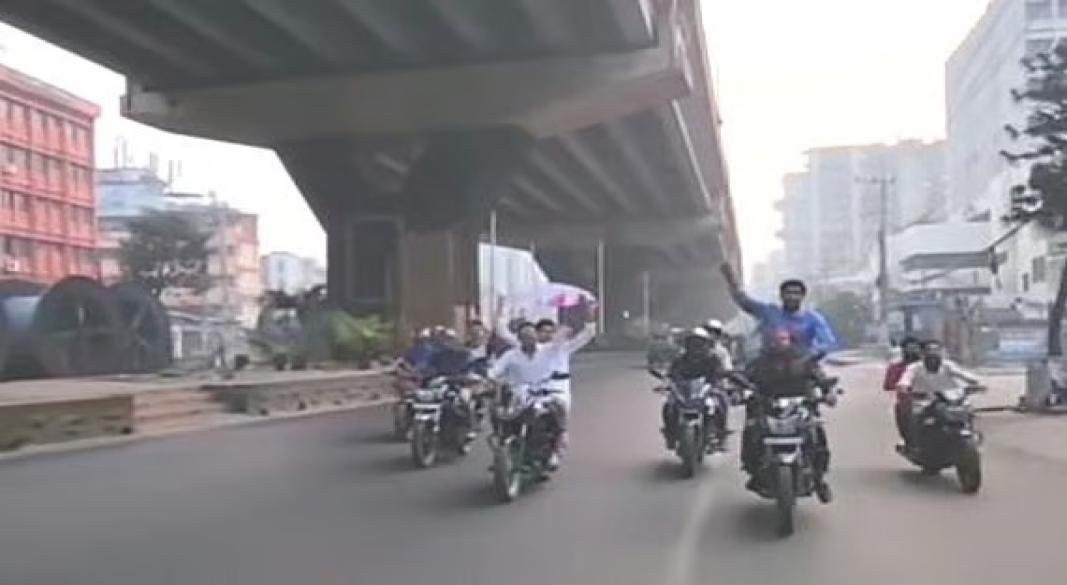 শনিবার (৭ মার্চ) ভোরে নগরের ২ নম্বর গেট এলাকায় উড়ালসড়কের নিচে কয়েকজন যুবক মোটরসাইকেল নিয়ে শোভাযাত্রা করেন। পরে এর একটি ভিডিও সামাজিক যোগাযোগমাধ্যমে ছড়িয়ে পড়ে।