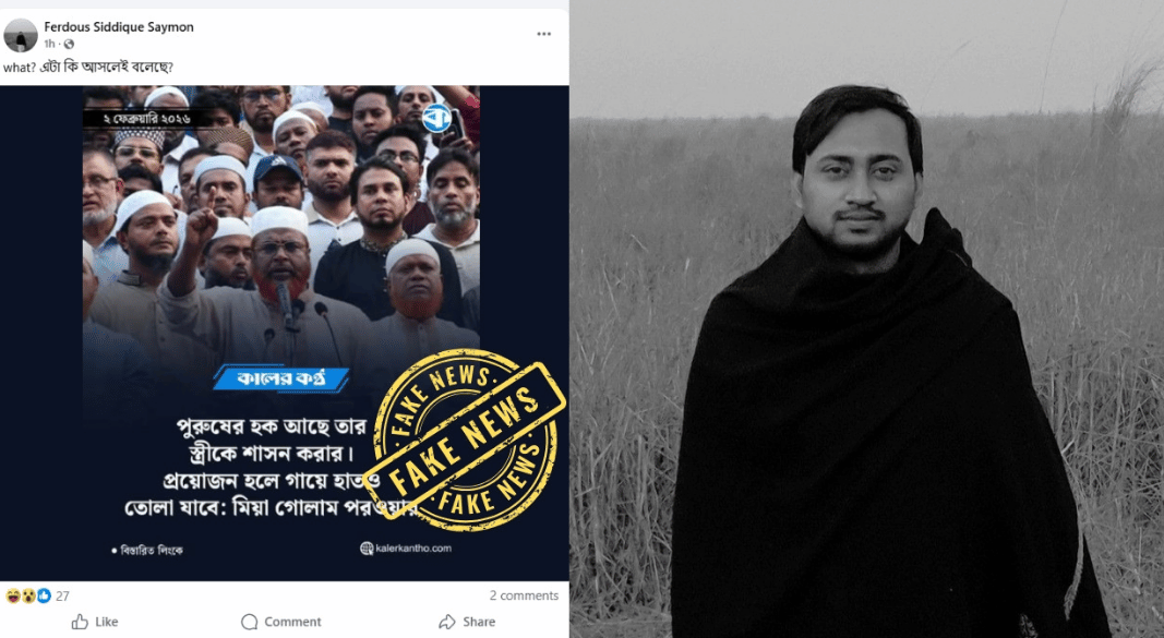 প্রথমত, কার্ডটির ফন্ট স্টাইল, সাইজ এবং ডিজাইনের সাথে কালের কণ্ঠের আসল ফটোকার্ডের কোনো মিল নেই। দ্বিতীয়ত, কার্ডে ব্যবহৃত ছবিটি সাম্প্রতিক সময়ের নয়। এটি মূলত ২০২৫ সালের ২৮ অক্টোবর জামায়াতে ইসলামীর একটি সমাবেশের পুরনো ছবি, যা এডিট করে নতুন করে প্রচার করা হয়েছে। সবশেষে, মিয়া গোলাম পরওয়ারের নামে যে বক্তব্যটি সেখানে উল্লেখ করা হয়েছে, তার কোনো অস্তিত্ব দেশের মূলধারার গণমাধ্যমগুলোতে পাওয়া যায়নি।
