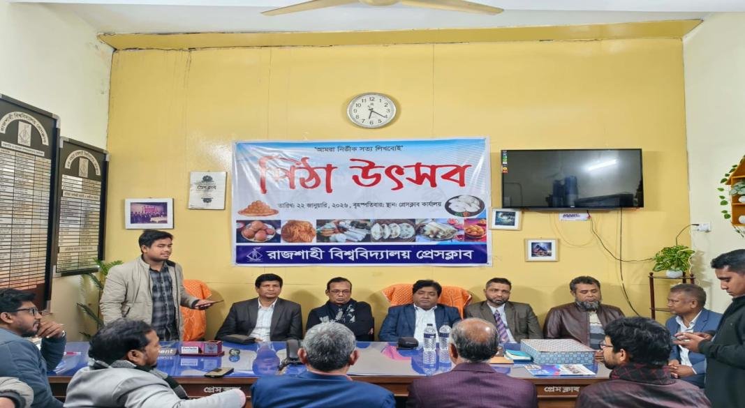 রাফাসান আলম রাবি প্রতিনিধি: শীতের আমেজে গ্রামবাংলার ঐতিহ্য ও ঘ্রাণ ছড়িয়ে দিতে রাজশাহী বিশ্ববিদ্যালয় (রাবি) প্রেসক্লাবের উদ্যোগে আয়োজন করা হয়েছে পিঠা উৎসব। বৃহস্পতিবার (২২ জানুয়ারি) সন্ধ্যা ৬টায় প্রেসক্লাব কার্যালয়ে আড়ম্বরপূর্ণ এই আয়োজনে রাজশাহীতে কর্মরত সাংবাদিকদের মিলনমেলায় পরিণত হয় অনুষ্ঠানটি।