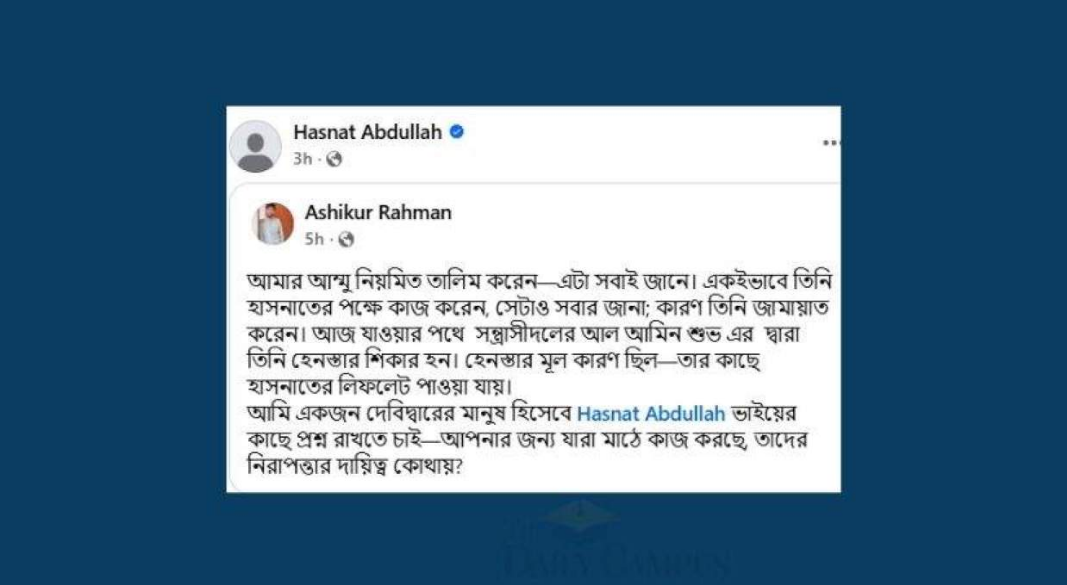 ক্ষুব্ধ কণ্ঠে তিনি হাসনাত আবদুল্লাহর কাছে প্রশ্ন রেখে লেখেন, "আমি একজন দেবিদ্বারের মানুষ হিসেবে হাসনাত ভাইয়ের কাছে প্রশ্ন রাখতে চাই—আপনার জন্য যারা মাঠে কাজ করছে, তাদের নিরাপত্তার দায়িত্ব কোথায়?"